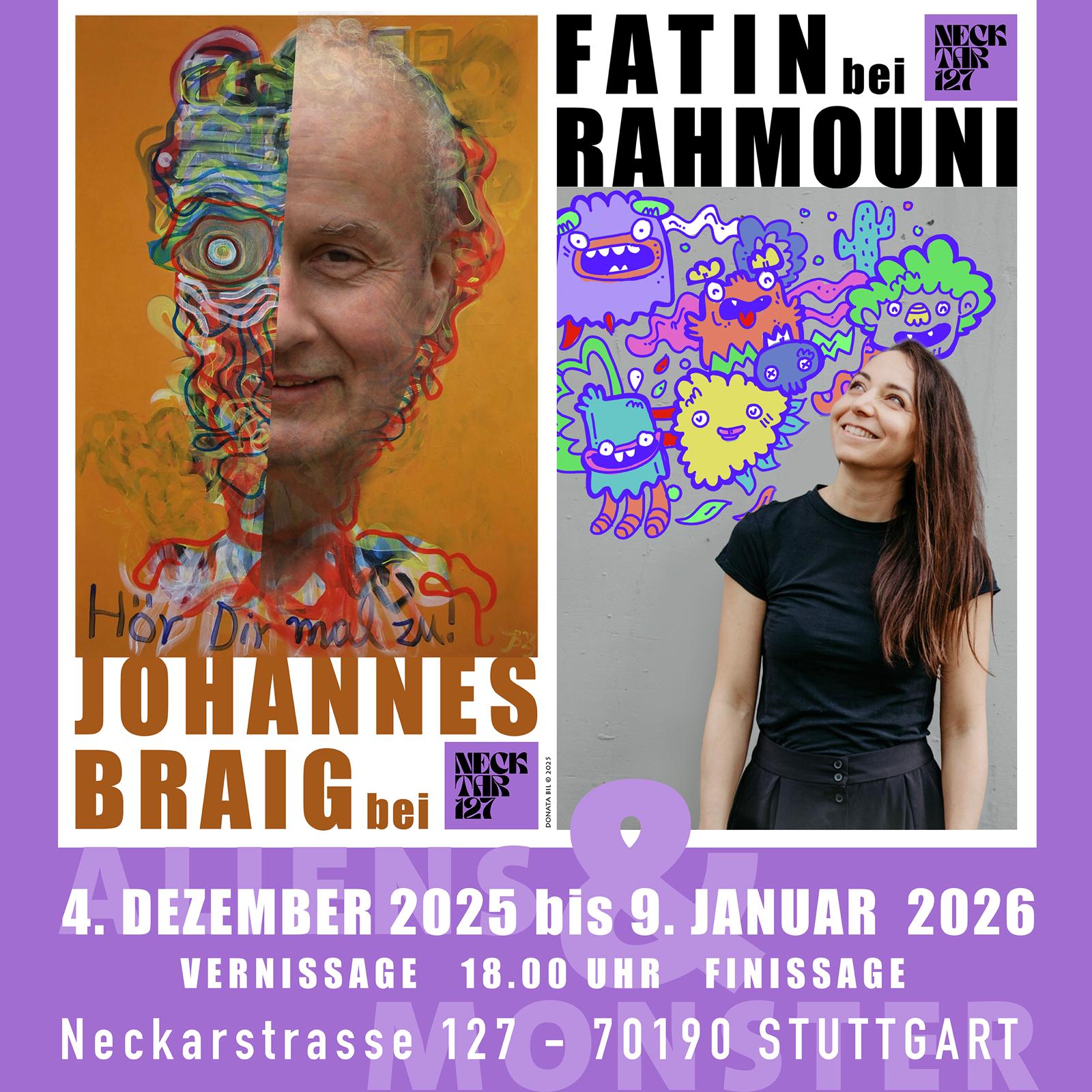 Wir eröffnen eine neue Ausstellung mit Fatin Rahmounis Monstern und Johannes Braigs Aliens & Figurationen.